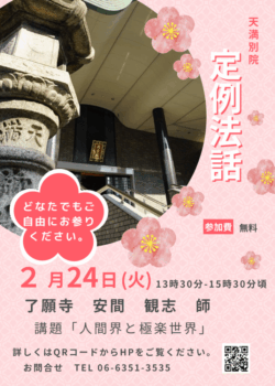 天満別院では、2月24日(火)13時30分より講堂にて定例法話が開催されます。