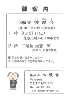 会員の法話実習の場として、心願寺(門真市)の彼岸会で二階堂光憲が法話します。彼岸を一日過ぎていますが、9/27(土)午後2時から、正信偈のお勤めの後、法話ですので、どなた様もどうぞお参りください。