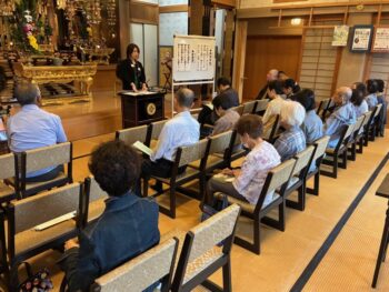 今回は、法觀寺坊守の廣瀬京子さんの発題で始まりました。前回の同朋の会座談で、癌の手術を控えたご門徒さんの苦悩を聞き、癌で苦しむ実父の闘病生活を支えた経験のある廣瀬さんがそれに共感し、その苦しみに寄り添ったことから、実父の看病を通して気づかされたことを話されました。家族は「どんな状況になっても生きていて欲しい」と願い、実父からは「まだ生きたい、生きていたい」という強い思いが感じられたと話されました。
