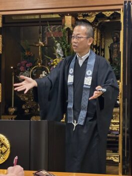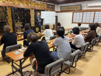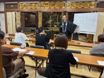 17組坊守会では、難波別院の竹中慈祥先生をお招きし「正信偈」についてご講義を頂戴しました。三帰依の意味に始まり、正信偈はお経ではなく、偈(ガータ・詩)であること、また正信偈は二部構成になっており、前半には阿弥陀仏の十二の光、後半は七高僧のことが書かれていることなど、若い坊守さんたちにとって、初めて知ることばかりで大変よい勉強になりました。また、その正信偈が書かれている『教行信証』のことについてもAmazonのレビューに喩えられ、とてもわかり易く面白くお話を進めて下さり、非常に興味深く熱心に聞くことができました。