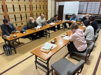 輪読した後の座談では、『念仏は、まことに浄土にうまるるたねにてやはんべるらん、また、地獄におつべき業にてやはんべるらん。総じてもって存知せざるなり』『いずれの行もおよびがたき身なれば、とても地獄は一定すみかぞかし』の2か所の部分については、特に参加者から様々な発言があり、親鸞聖人と門弟たちの対話する姿を想像しながら、興味深いディスカッションとなりました。