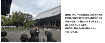 御影堂・阿弥陀堂の前では、「なぜ本願寺が度重なる火災から免れたのか」という興味深いお話を伺いました。