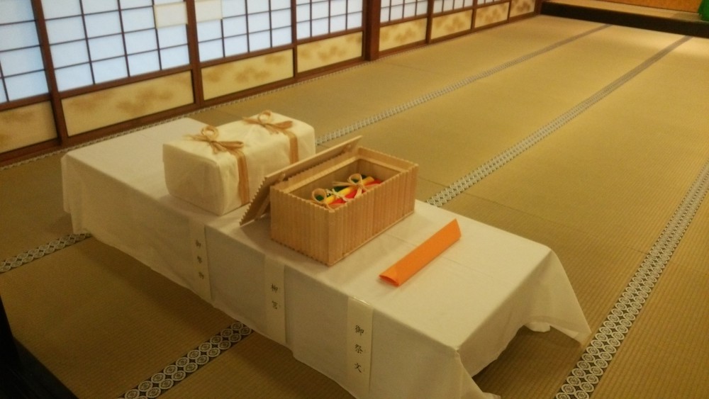 展示物には天皇陛下からの御幣物の実物があり、柳筥(やないばこ)には五色の絹の織物が入っていました。